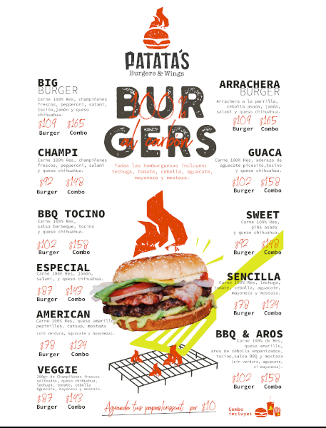 Todo comenzo en una pequeña cabaña dentro de un terreno baldío a principios de noviembre del año 2003, bajo el nombre de “lechugas”, con el objetivo de ofrecer la mejor hamburguesa al carbón de la zona, ubicada en la colonia roma sur en Monterrey, Nuevo León . En el año 2005 se inicia una etapa de reestructuracion cambiando su nombre a “patata’s burger”. Apartir del año 2015 evoluciona a patata’s burgers & wings, iniciando un proceso de innovación y desarrollo de imagen corporativa, buscando asi que nuestros clientes disfruten de una mejor experiencia patata’s en todos los sentidos. Misión Que nuestros clientes disfruten de una mejor experiencia patata’s en todos los sentidos. Visión Que todas las ciudades del mundo vivan y disfruten de la experiencia patata`s. |
